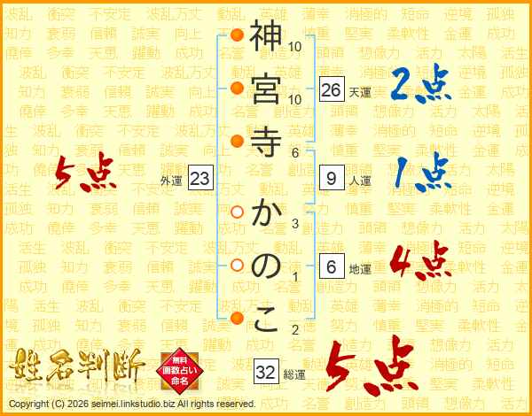 神(10画)宮(10画)寺(6画) か(3画)の(1画)こ(2画)