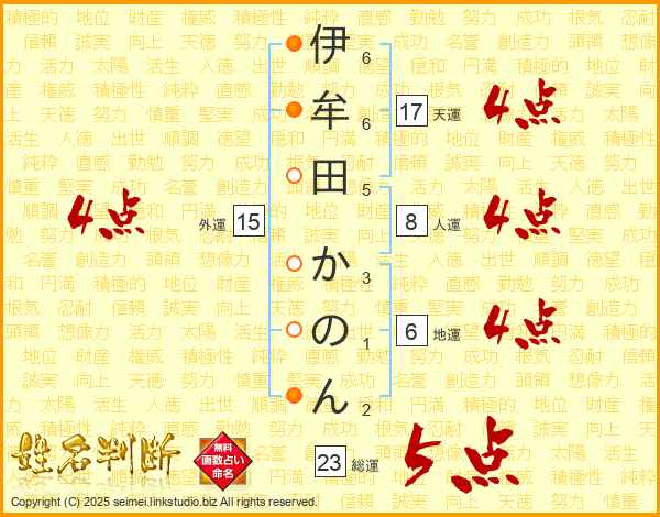 伊(6画)牟(6画)田(5画) か(3画)の(1画)ん(2画)