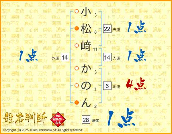 小(3画)松(8画)﨑(11画) か(3画)の(1画)ん(2画)