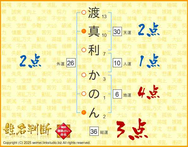 生活面を象徴する運勢です。外部から受ける影響力を表し、結婚運、家庭運や職場、環境への順応性を表します。総運から人運を引いた画数。姓や名が1文字の場合を除く。