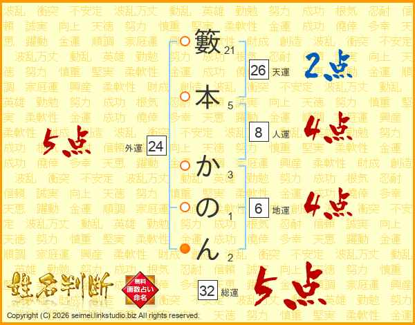 生活面を象徴する運勢です。外部から受ける影響力を表し、結婚運、家庭運や職場、環境への順応性を表します。総運から人運を引いた画数。姓や名が1文字の場合を除く。