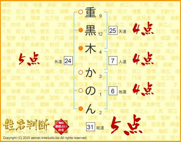 重黒木かのんさんの天運は25画の4点!