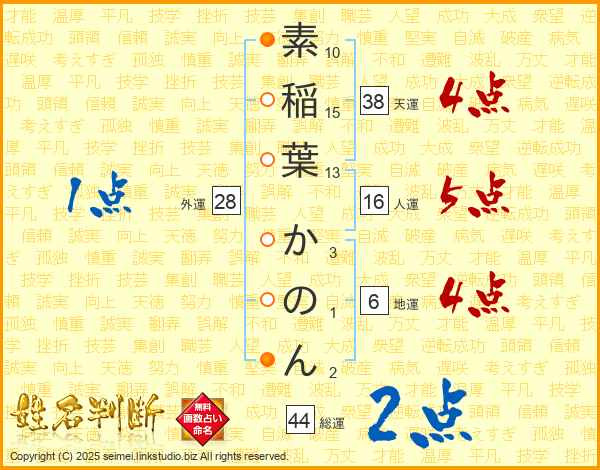 素(10画)稲(15画)葉(13画) か(3画)の(1画)ん(2画)
