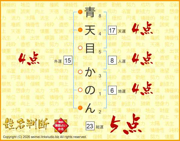 青(8画)天(4画)目(5画) か(3画)の(1画)ん(2画)