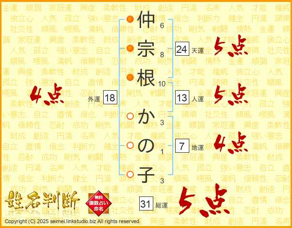 仲(6画)宗(8画)根(10画) か(3画)の(1画)子(3画)