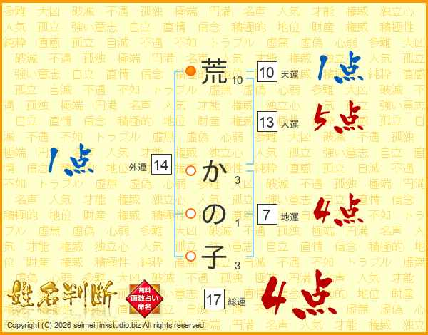 生活面を象徴する運勢です。外部から受ける影響力を表し、結婚運、家庭運や職場、環境への順応性を表します。総運から人運を引いた画数。姓や名が1文字の場合を除く。