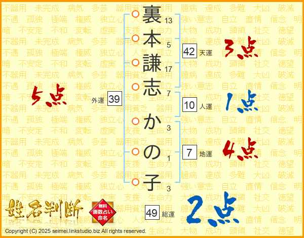 裏(13画)本(5画)謙(17画)志(7画) か(3画)の(1画)子(3画)