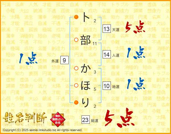 生活面を象徴する運勢です。外部から受ける影響力を表し、結婚運、家庭運や職場、環境への順応性を表します。総運から人運を引いた画数。姓や名が1文字の場合を除く。