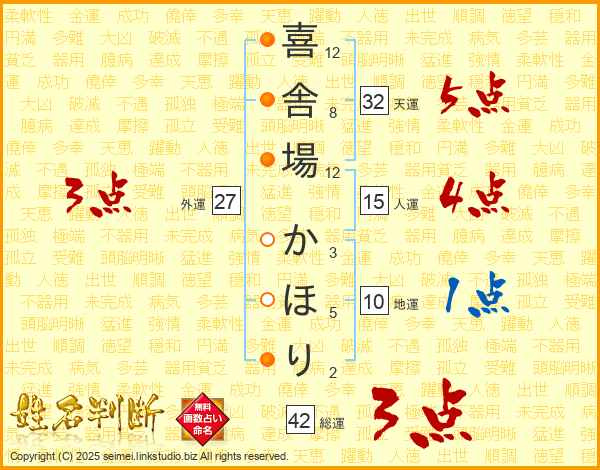 喜(12画)舎(8画)場(12画) か(3画)ほ(5画)り(2画)