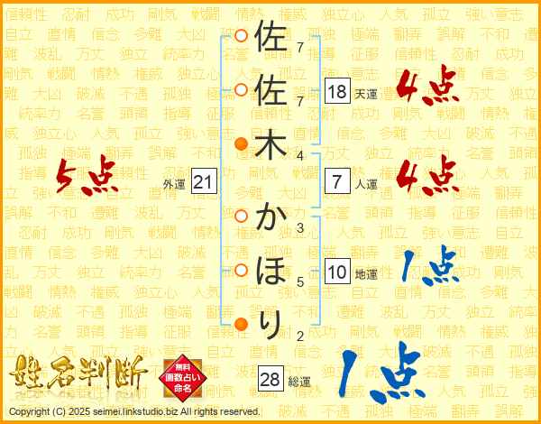佐佐木かほりさんの外運は21画の5点!