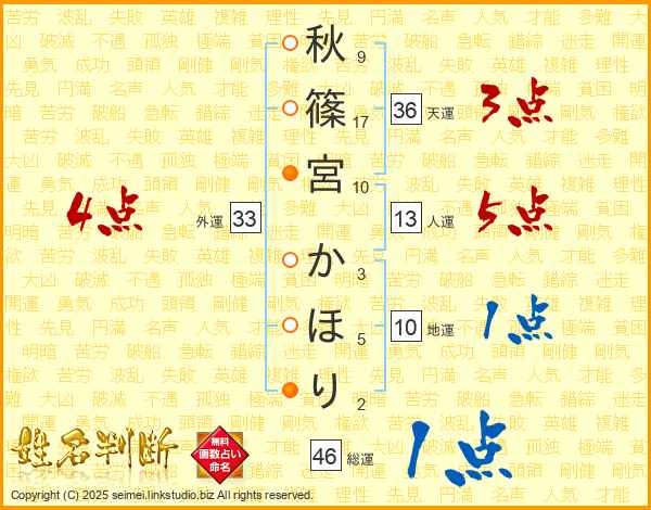秋(9画)篠(17画)宮(10画) か(3画)ほ(5画)り(2画)