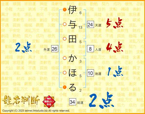 伊(6画)与(13画)田(5画) か(3画)ほ(5画)る(2画)