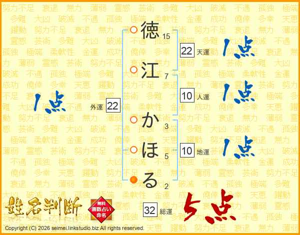 徳江かほるさんの総運は32画の5点!