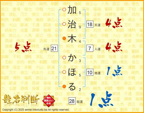 生活面を象徴する運勢です。外部から受ける影響力を表し、結婚運、家庭運や職場、環境への順応性を表します。総運から人運を引いた画数。姓や名が1文字の場合を除く。
