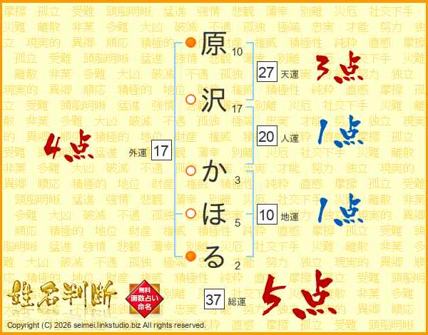 原沢かほるさんの総運は37画の5点!