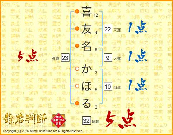 喜(12画)友(4画)名(6画) か(3画)ほ(5画)る(2画)