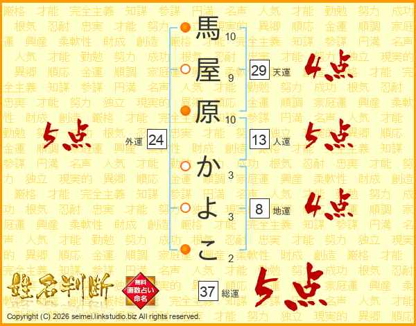 馬屋原かよこさんの総運は37画の5点!