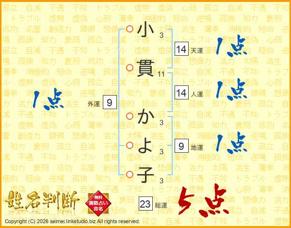 小貫かよ子さんの天運は14画の1点!