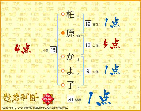 柏原かよ子さんの総運は28画の1点!