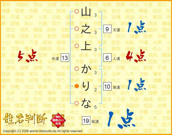 生活面を象徴する運勢です。外部から受ける影響力を表し、結婚運、家庭運や職場、環境への順応性を表します。総運から人運を引いた画数。姓や名が1文字の場合を除く。