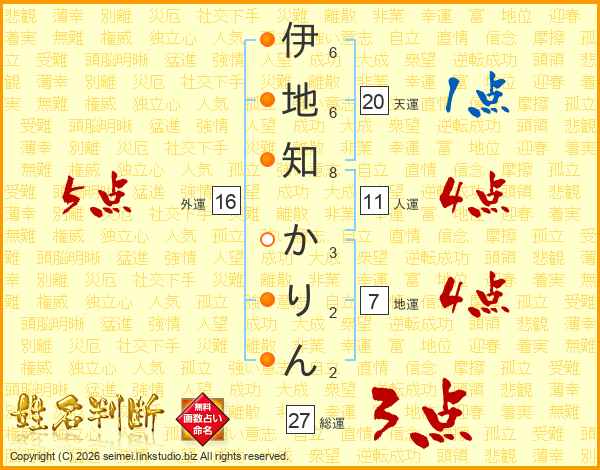 伊(6画)地(6画)知(8画) か(3画)り(2画)ん(2画)