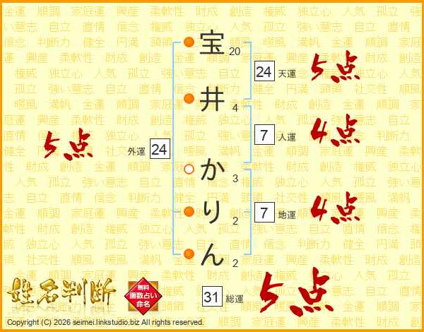 宝井かりんさんの外運は24画の5点!