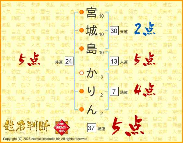 宮(10画)城(10画)島(10画) か(3画)り(2画)ん(2画)