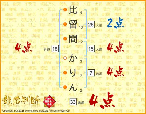比留間かりんさんの天運は26画の2点!