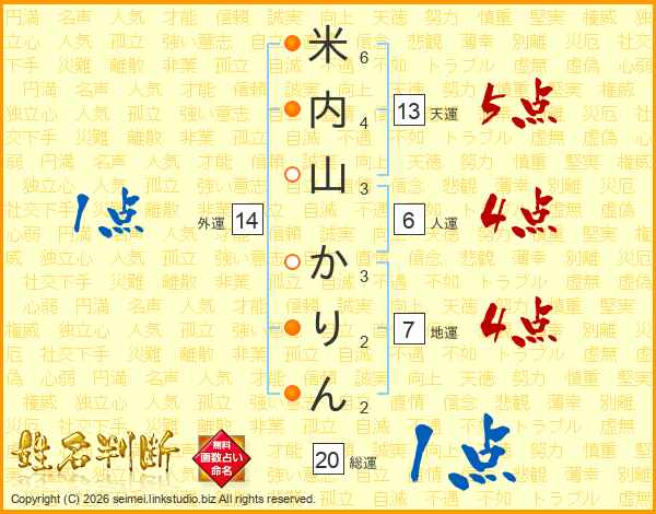 生活面を象徴する運勢です。外部から受ける影響力を表し、結婚運、家庭運や職場、環境への順応性を表します。総運から人運を引いた画数。姓や名が1文字の場合を除く。