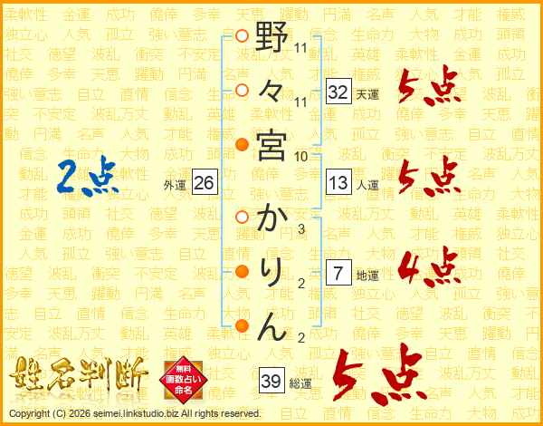 生活面を象徴する運勢です。外部から受ける影響力を表し、結婚運、家庭運や職場、環境への順応性を表します。総運から人運を引いた画数。姓や名が1文字の場合を除く。
