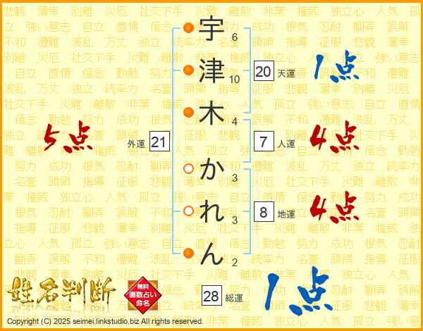 宇(6画)津(10画)木(4画) か(3画)れ(3画)ん(2画)