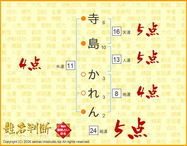 寺島かれんさんの天運は16画の5点!