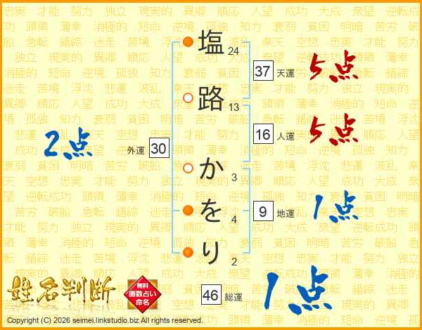 塩(24画)路(13画) か(3画)を(4画)り(2画)