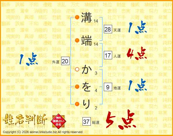 生活面を象徴する運勢です。外部から受ける影響力を表し、結婚運、家庭運や職場、環境への順応性を表します。総運から人運を引いた画数。姓や名が1文字の場合を除く。
