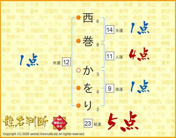 生活面を象徴する運勢です。外部から受ける影響力を表し、結婚運、家庭運や職場、環境への順応性を表します。総運から人運を引いた画数。姓や名が1文字の場合を除く。