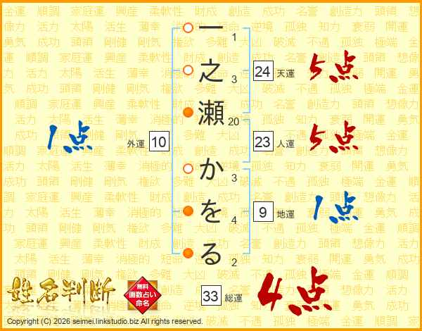 一之瀬かをるさんの総運は33画の4点!