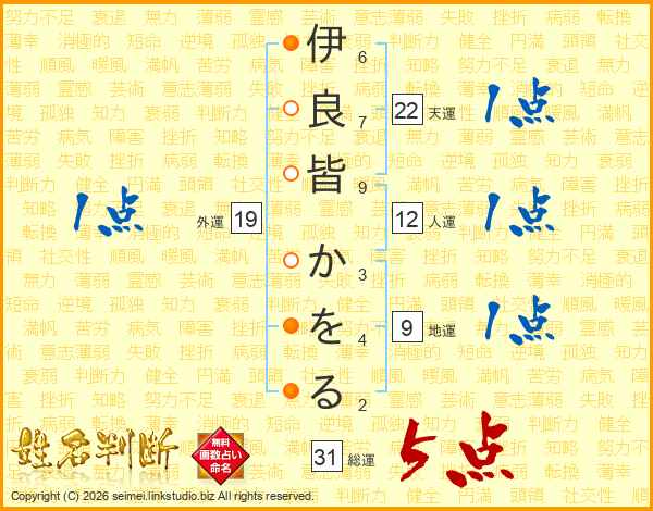 伊(6画)良(7画)皆(9画) か(3画)を(4画)る(2画)