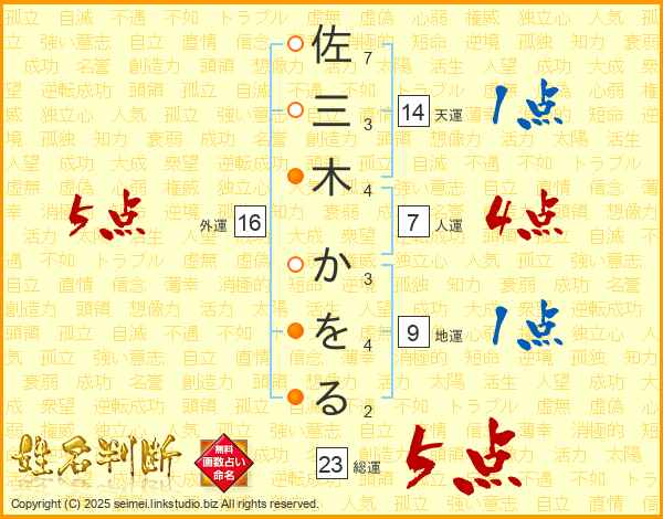 佐三木かをるさんの総運は23画の5点!