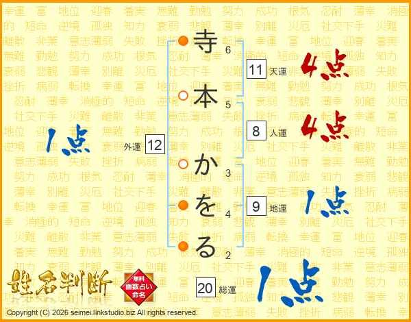 生活面を象徴する運勢です。外部から受ける影響力を表し、結婚運、家庭運や職場、環境への順応性を表します。総運から人運を引いた画数。姓や名が1文字の場合を除く。