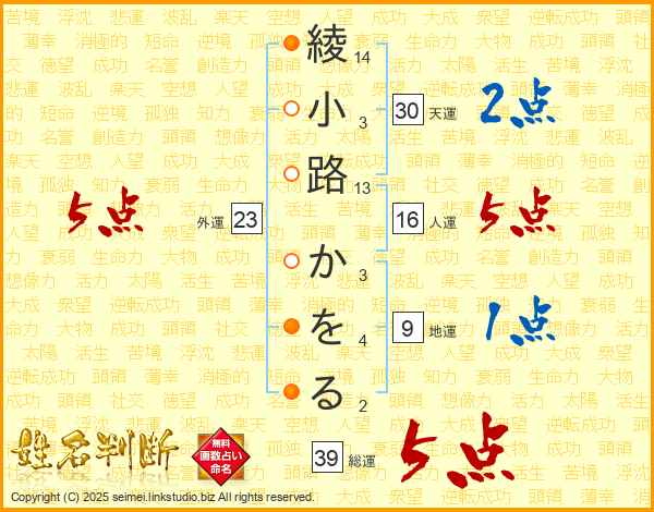 綾(14画)小(3画)路(13画) か(3画)を(4画)る(2画)