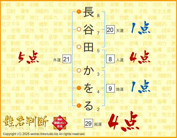長(8画)谷(7画)田(5画) か(3画)を(4画)る(2画)