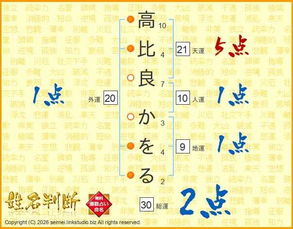生活面を象徴する運勢です。外部から受ける影響力を表し、結婚運、家庭運や職場、環境への順応性を表します。総運から人運を引いた画数。姓や名が1文字の場合を除く。