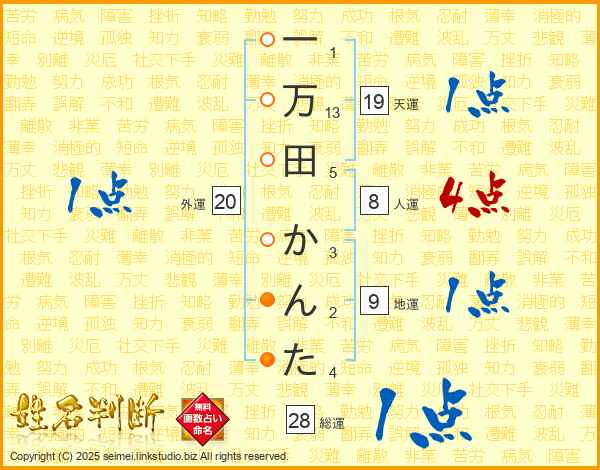 一(1画)万(13画)田(5画) か(3画)ん(2画)た(4画)