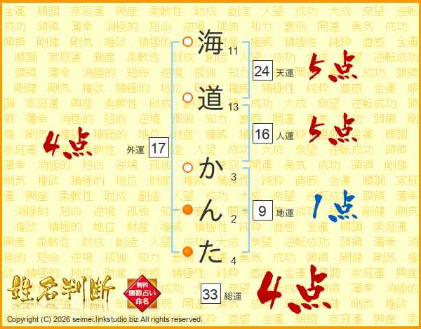 海(11画)道(13画) か(3画)ん(2画)た(4画)