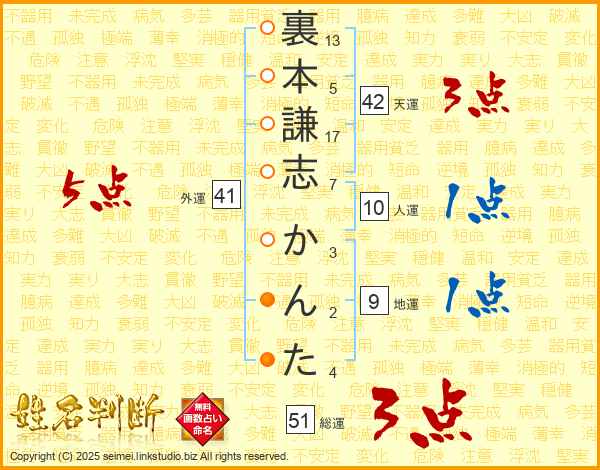 裏(13画)本(5画)謙(17画)志(7画) か(3画)ん(2画)た(4画)