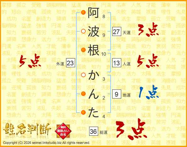 阿(8画)波(9画)根(10画) か(3画)ん(2画)た(4画)