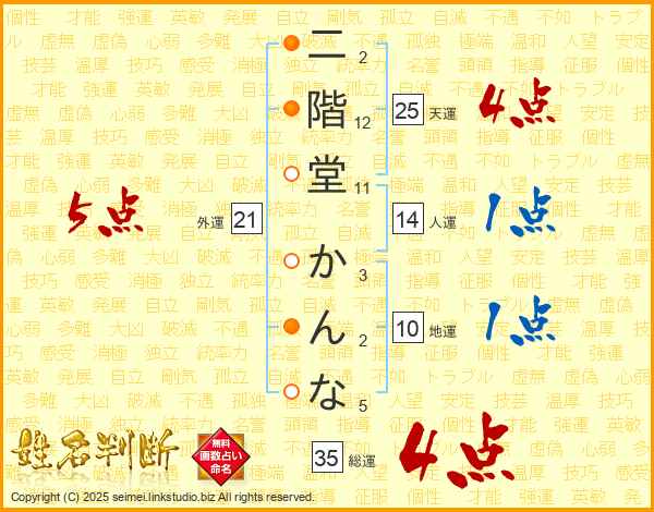 生活面を象徴する運勢です。外部から受ける影響力を表し、結婚運、家庭運や職場、環境への順応性を表します。総運から人運を引いた画数。姓や名が1文字の場合を除く。