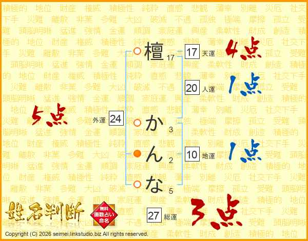 生活面を象徴する運勢です。外部から受ける影響力を表し、結婚運、家庭運や職場、環境への順応性を表します。総運から人運を引いた画数。姓や名が1文字の場合を除く。
