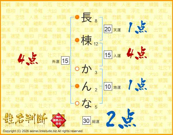 長(8画)棟(12画) か(3画)ん(2画)な(5画)