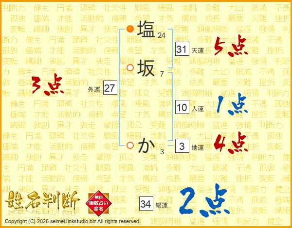 生活面を象徴する運勢です。外部から受ける影響力を表し、結婚運、家庭運や職場、環境への順応性を表します。総運から人運を引いた画数。姓や名が1文字の場合を除く。